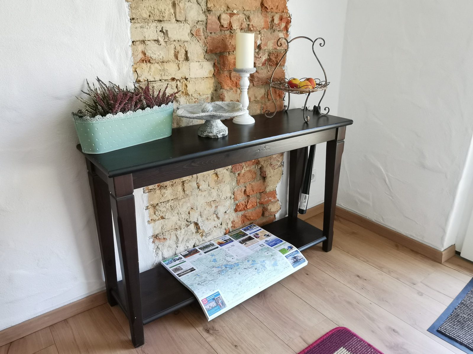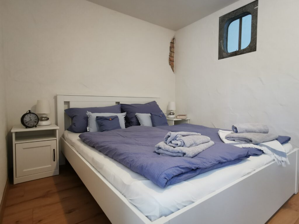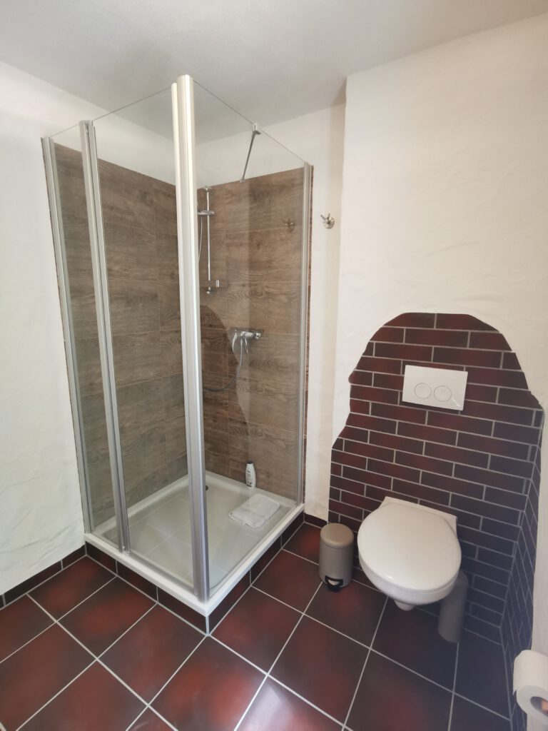 Im Zimmer Nr. 2 trifft Alt auf Neu. Es wurde ein spannender Mix zwischen altem Sichtmauerwerk und neuer Wand geschaffen. Die Möbel und die Inneneinrichtung folgen diesem Ansatz und sind perfekt auf das Zimmer abgestimmt. Vom Bett aus haben Sie einen unverbauten Blick auf die Schlosskapelle. Das Doppelbett ist 1,80×2,00 m groß.