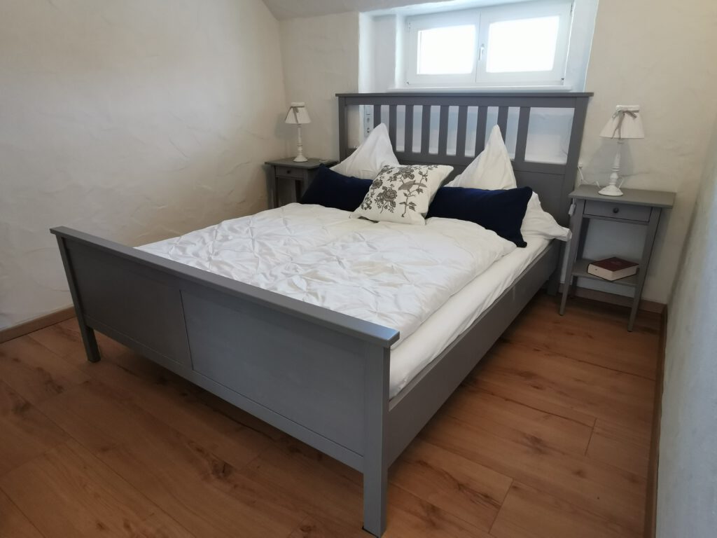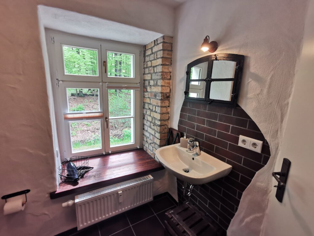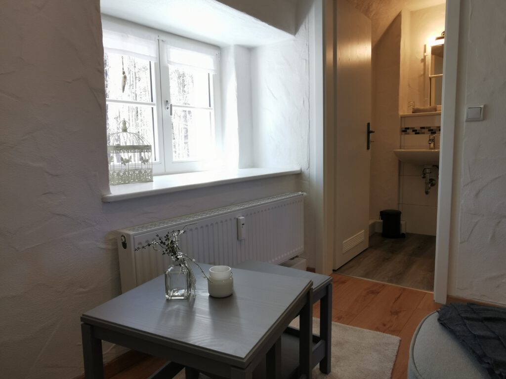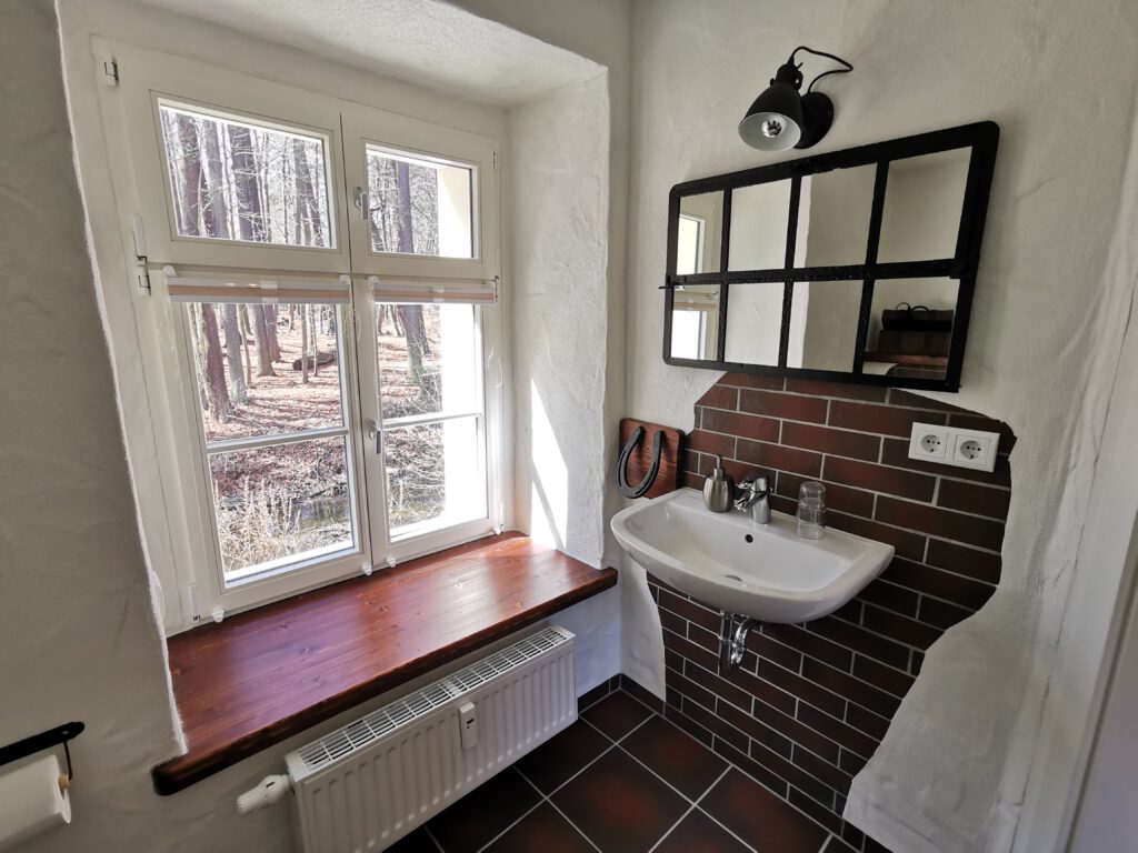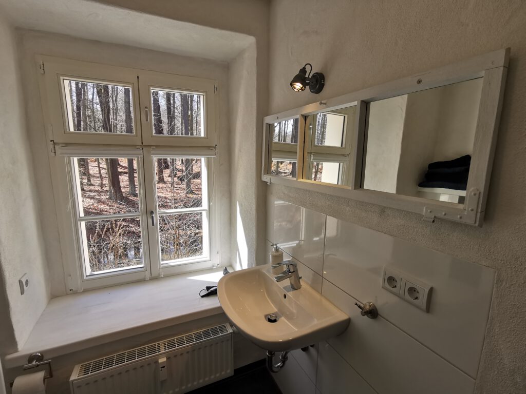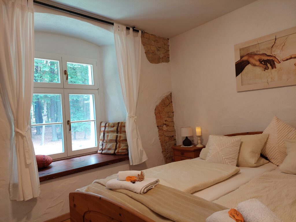 Passend zum Namen ist es ein ländliches Zweibettzimmer, mit einem gemütlichen Doppelbett (1,80×2,00 m). Sie können von diesem Zimmer aus dem Bett heraus in den Wald schauen. Gern können Sie sich auch auf die 60cm tiefe Fensterbank setzen und dabei ein Buch lesen oder einfach nur in den Wald schauen und die Seele baumeln lassen. Das Zimmer folgt dem Landhausstil mit rustikalem Einfluss, welcher zum Beispiel durch einen alten Balken um 1850 zum Vorschein kommt. Es wird teilweise originales, altes Sichtmauerwerk gezeigt.