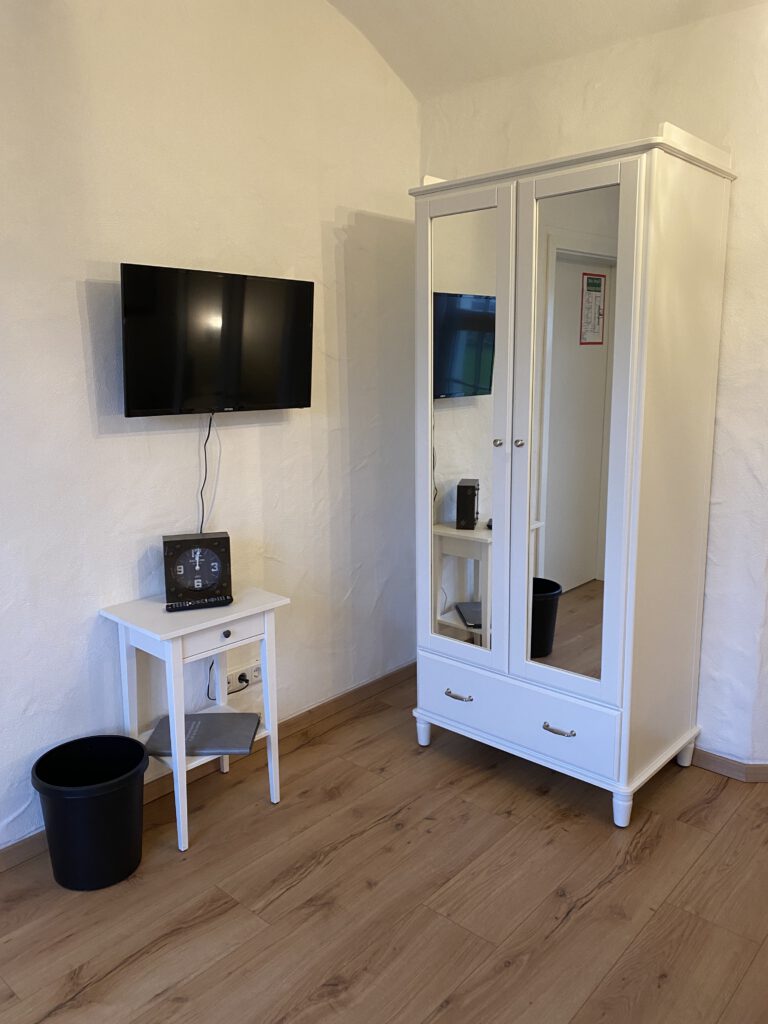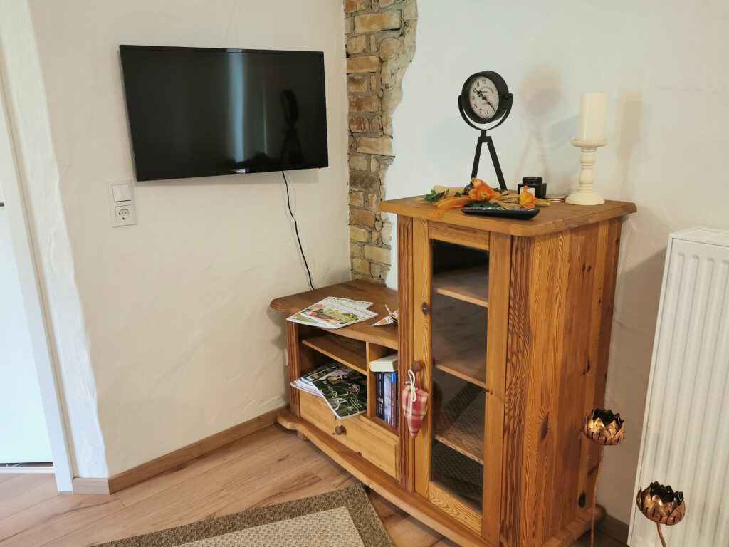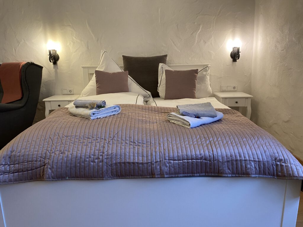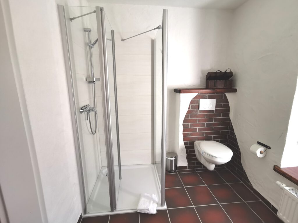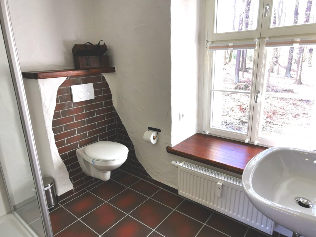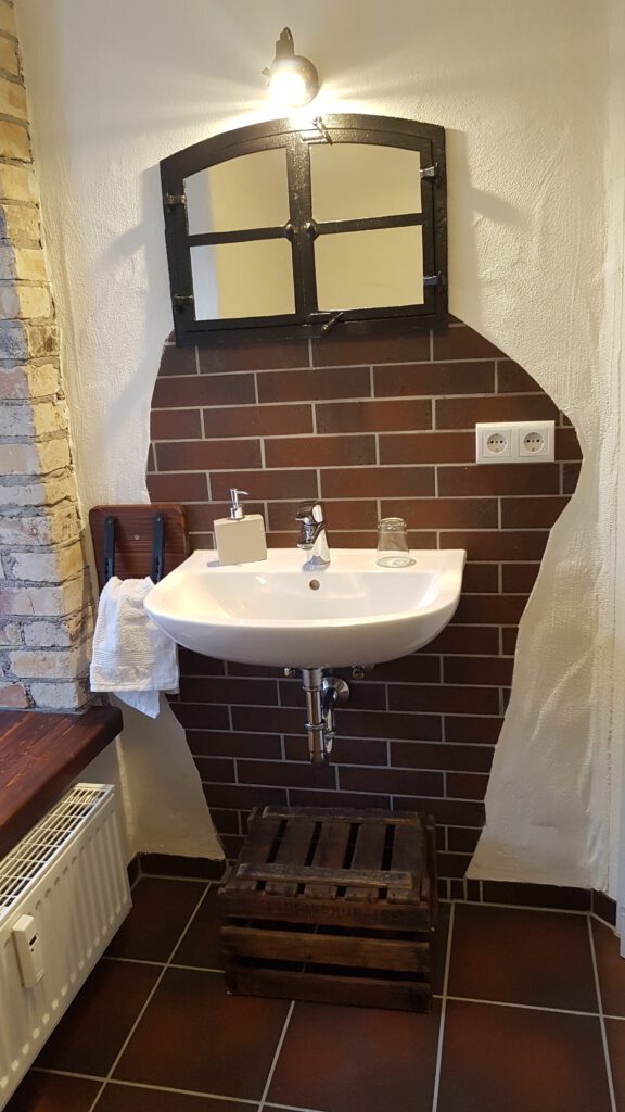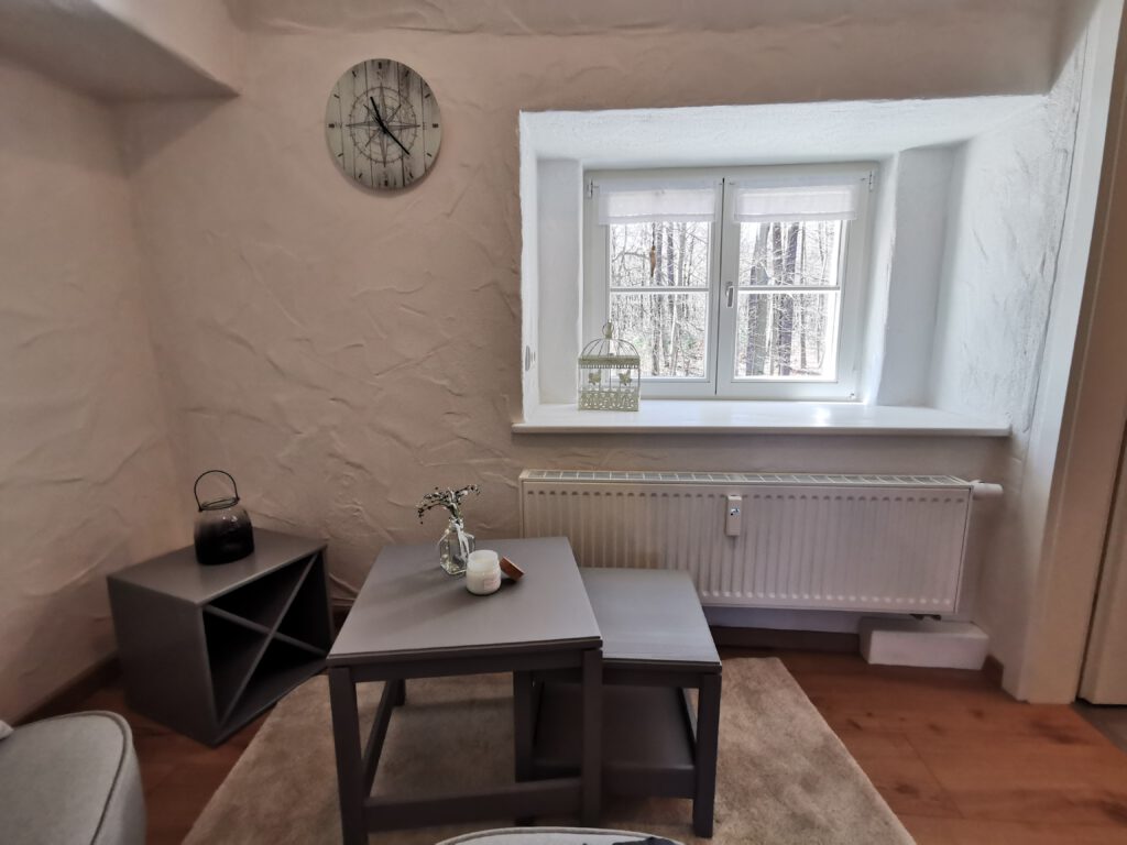 Passend zum Namen ist es ein ländliches Zweibettzimmer, mit einem gemütlichen Doppelbett (1,80×2,00 m). Sie können von diesem Zimmer aus dem Bett heraus in den Wald schauen. Gern können Sie sich auch auf die 60cm tiefe Fensterbank setzen und dabei ein Buch lesen oder einfach nur in den Wald schauen und die Seele baumeln lassen. Das Zimmer folgt dem Landhausstil mit rustikalem Einfluss, welcher zum Beispiel durch einen alten Balken um 1850 zum Vorschein kommt. Es wird teilweise originales, altes Sichtmauerwerk gezeigt.