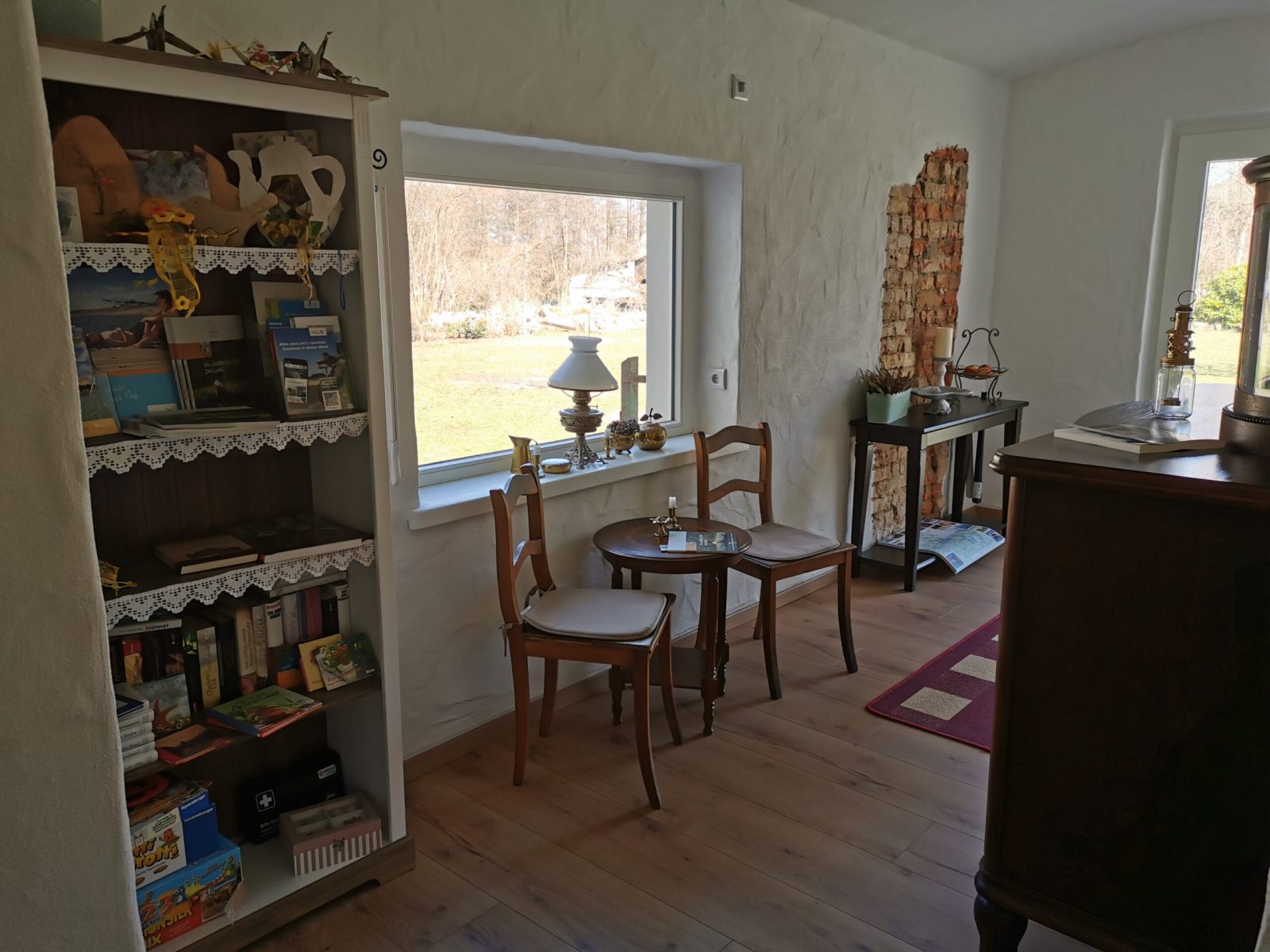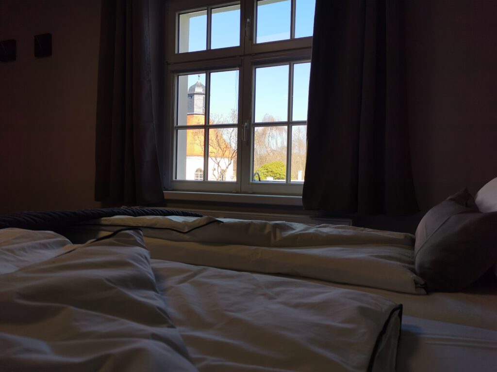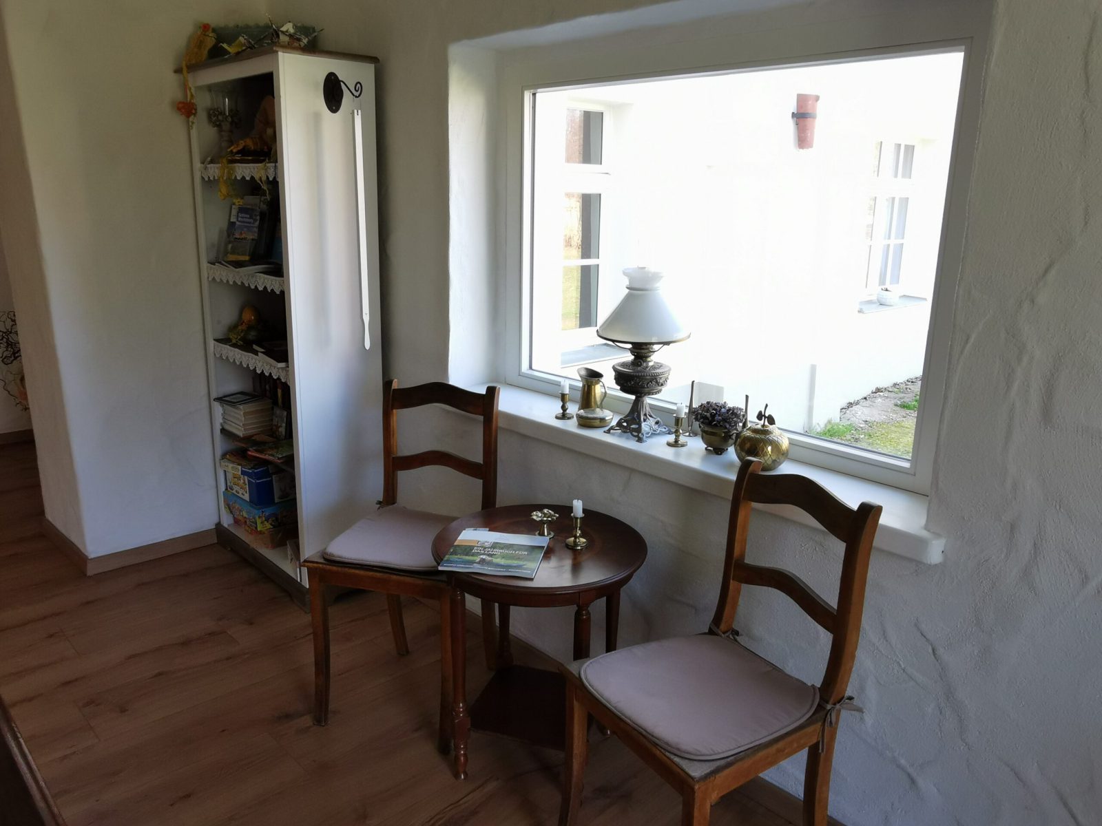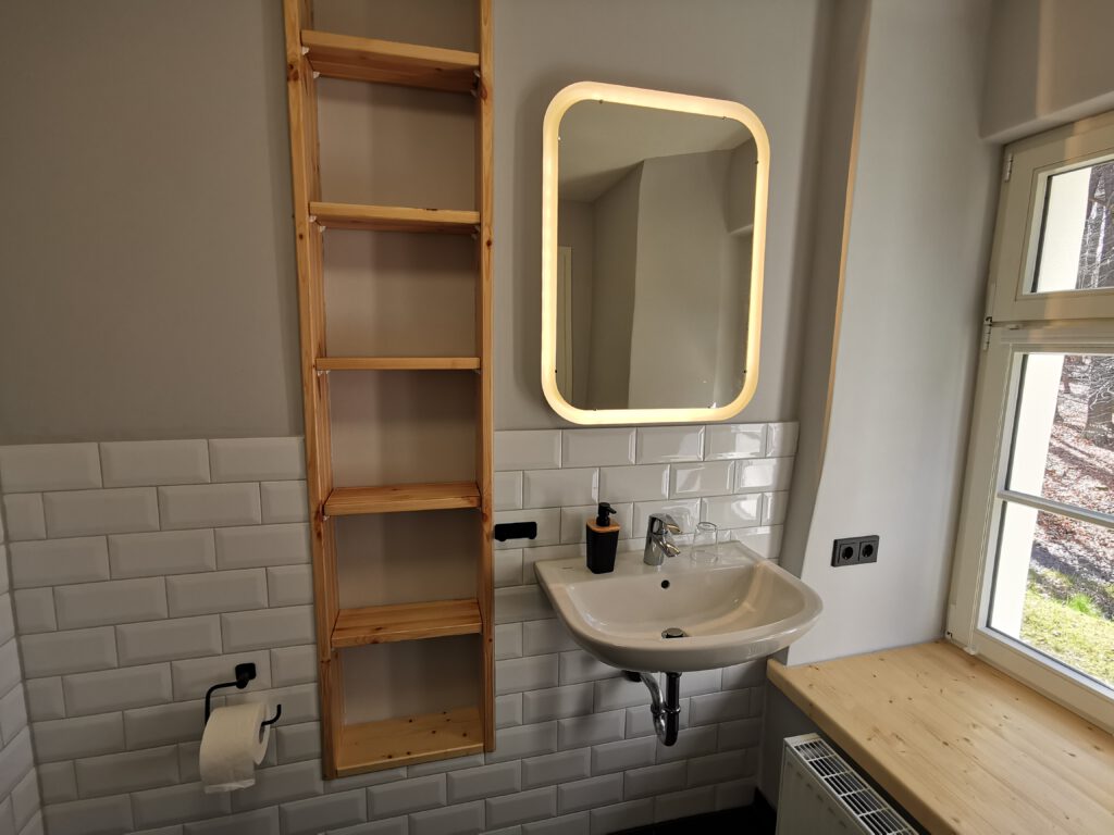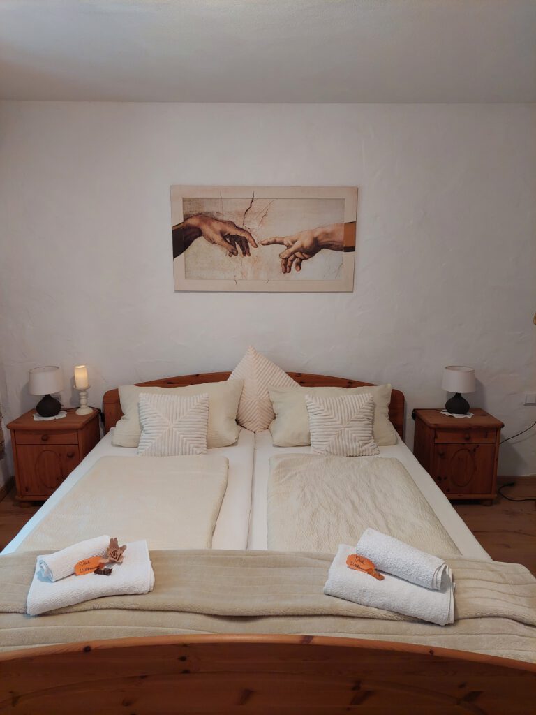 Passend zum Namen ist es ein ländliches Zweibettzimmer, mit einem gemütlichen Doppelbett (1,80×2,00 m). Sie können von diesem Zimmer aus dem Bett heraus in den Wald schauen. Gern können Sie sich auch auf die 60cm tiefe Fensterbank setzen und dabei ein Buch lesen oder einfach nur in den Wald schauen und die Seele baumeln lassen. Das Zimmer folgt dem Landhausstil mit rustikalem Einfluss, welcher zum Beispiel durch einen alten Balken um 1850 zum Vorschein kommt. Es wird teilweise originales, altes Sichtmauerwerk gezeigt.