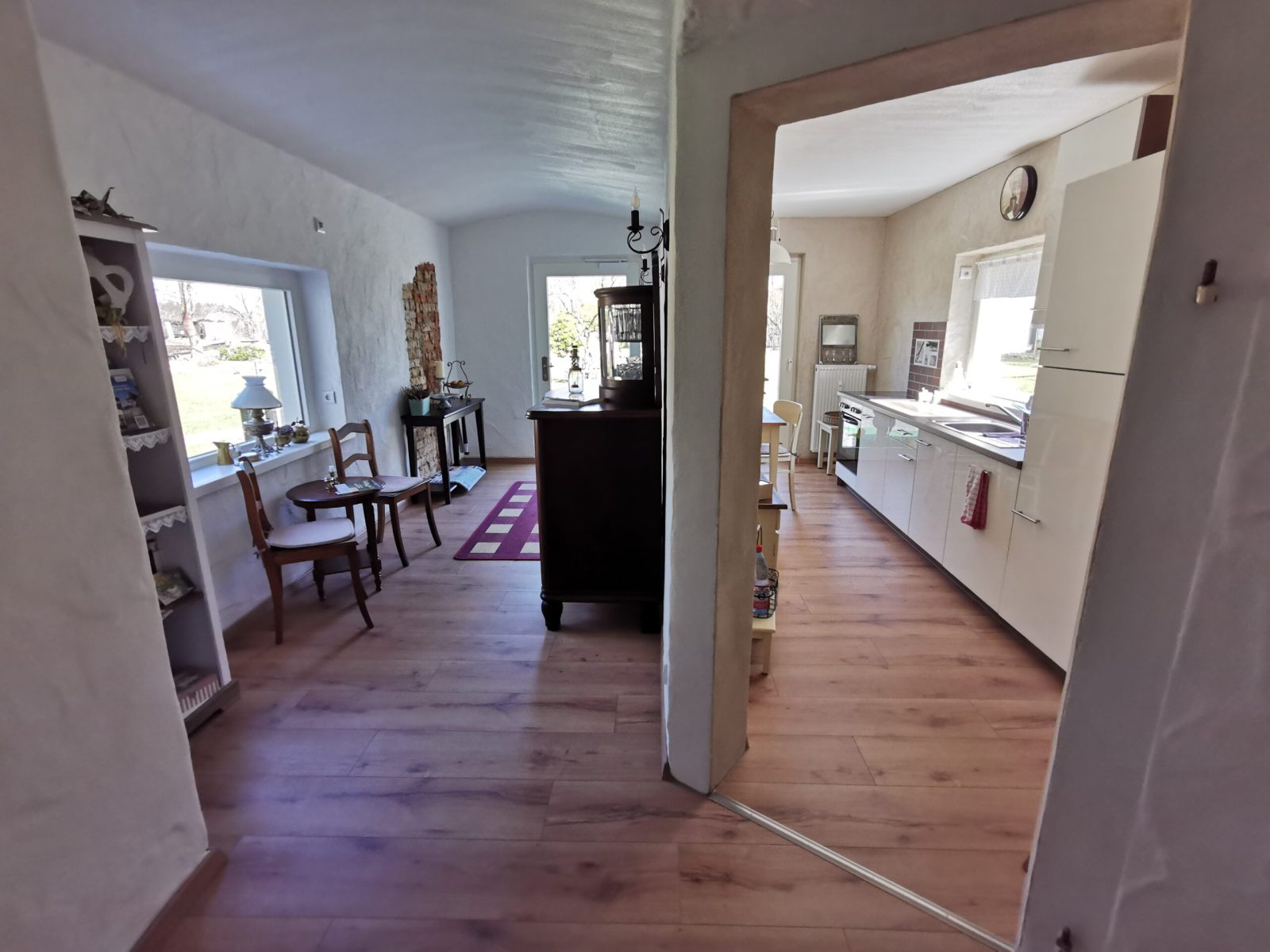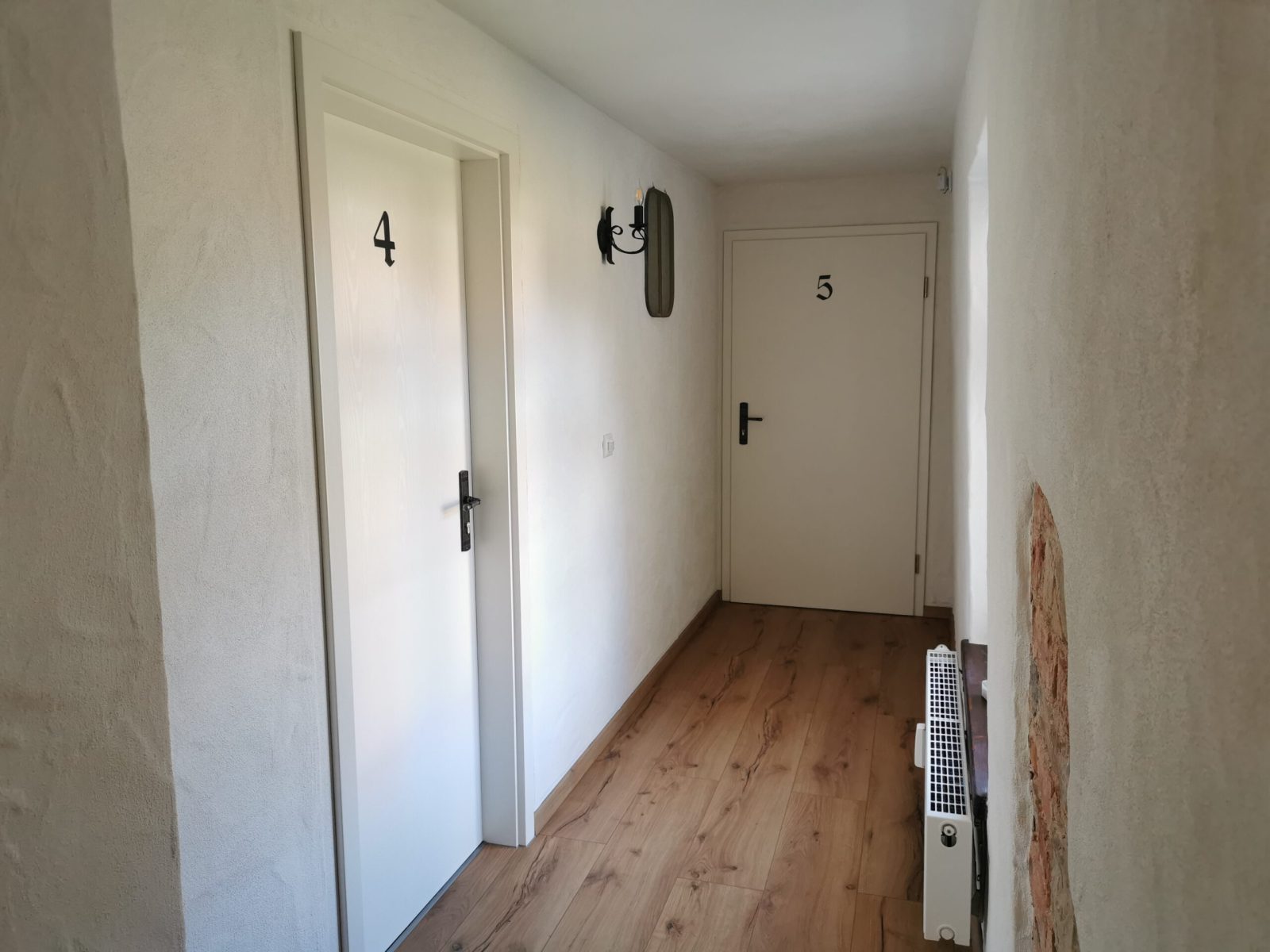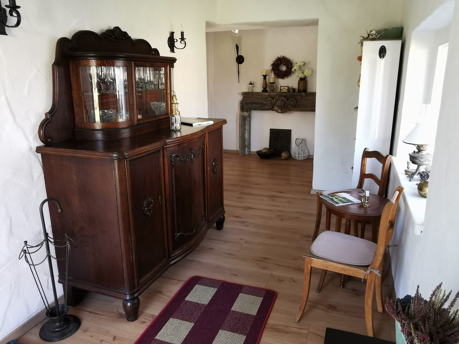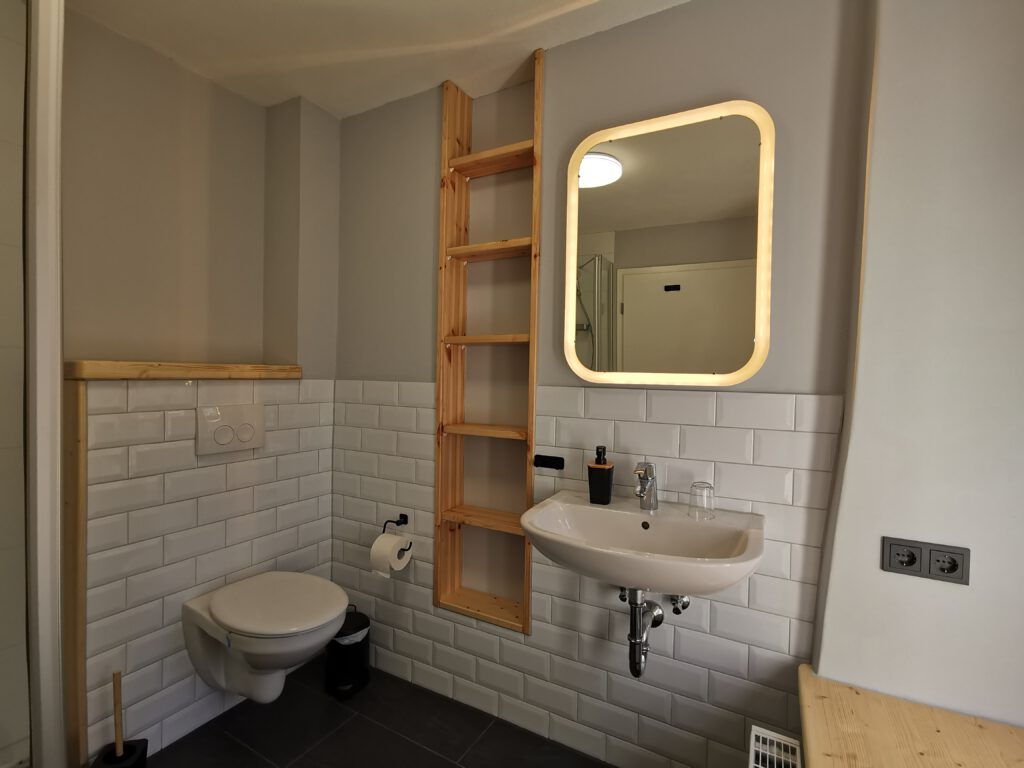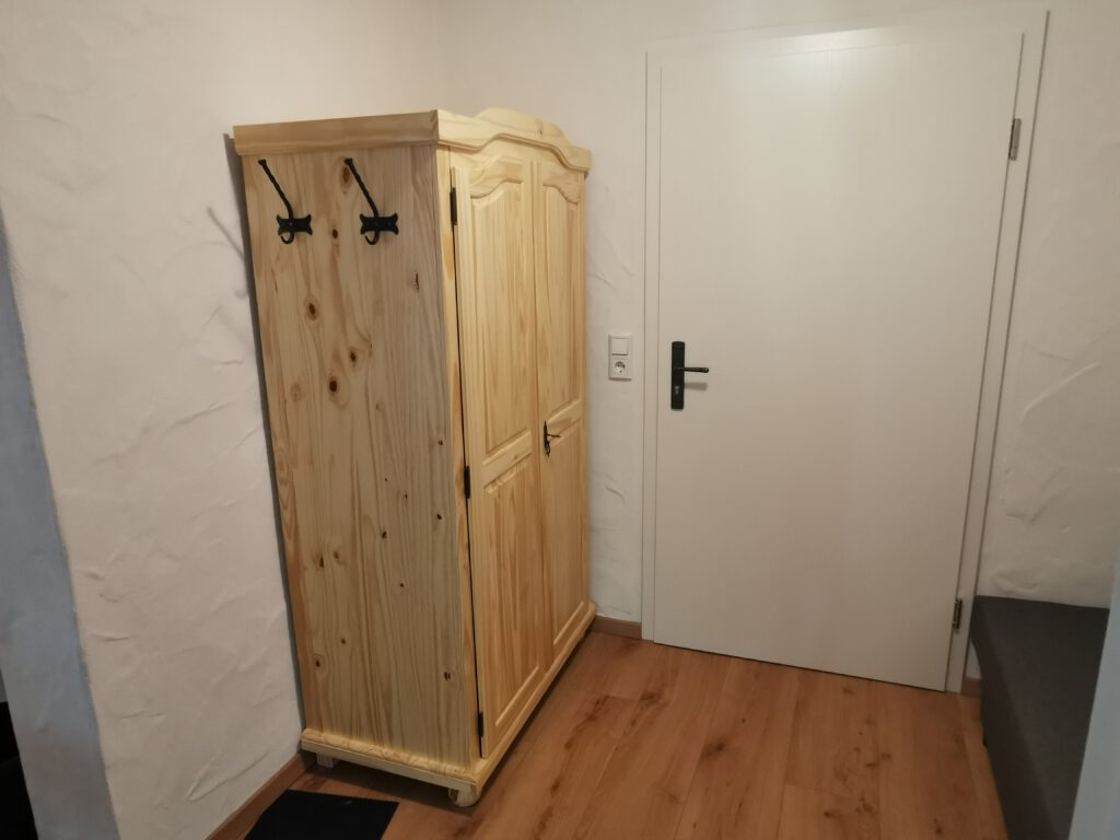 Passend zum Namen ist es ein ländliches Zweibettzimmer, mit einem gemütlichen Doppelbett (1,80×2,00 m). Sie können von diesem Zimmer aus dem Bett heraus in den Wald schauen. Gern können Sie sich auch auf die 60cm tiefe Fensterbank setzen und dabei ein Buch lesen oder einfach nur in den Wald schauen und die Seele baumeln lassen. Das Zimmer folgt dem Landhausstil mit rustikalem Einfluss, welcher zum Beispiel durch einen alten Balken um 1850 zum Vorschein kommt. Es wird teilweise originales, altes Sichtmauerwerk gezeigt.