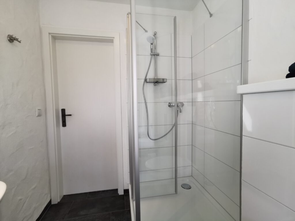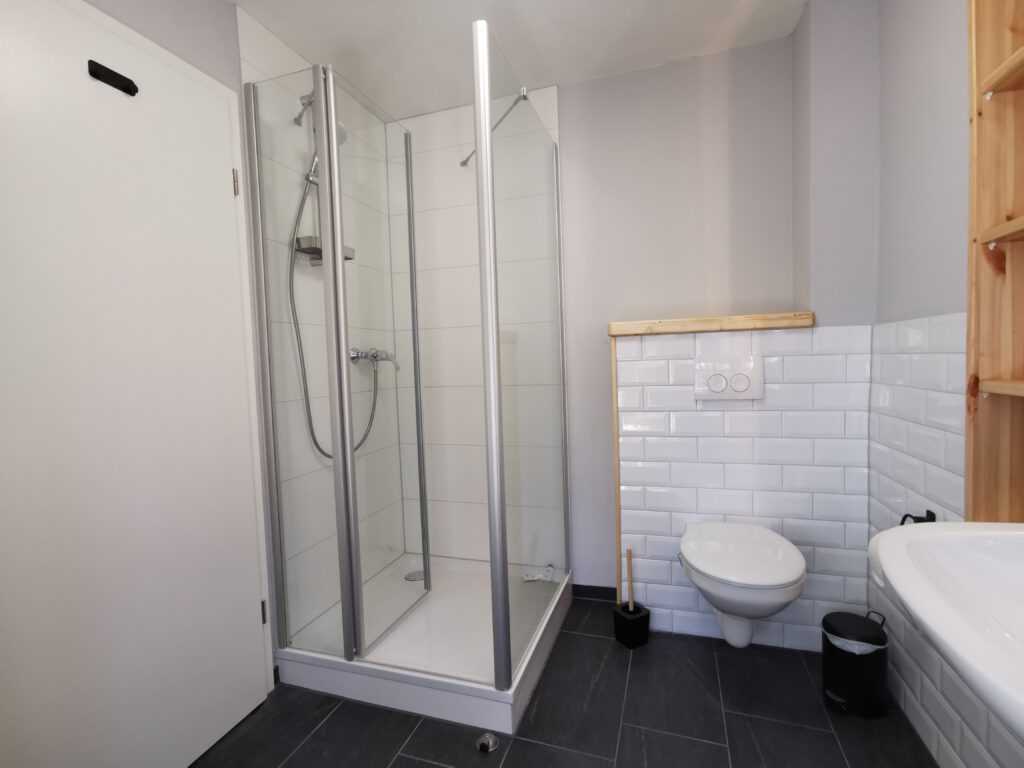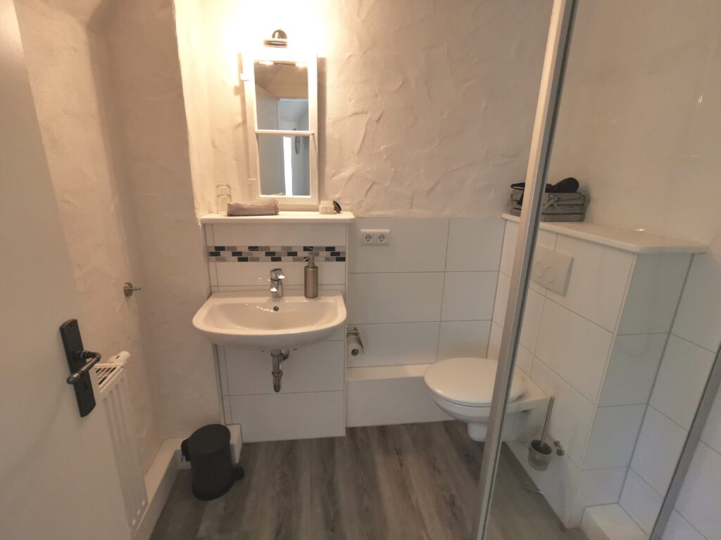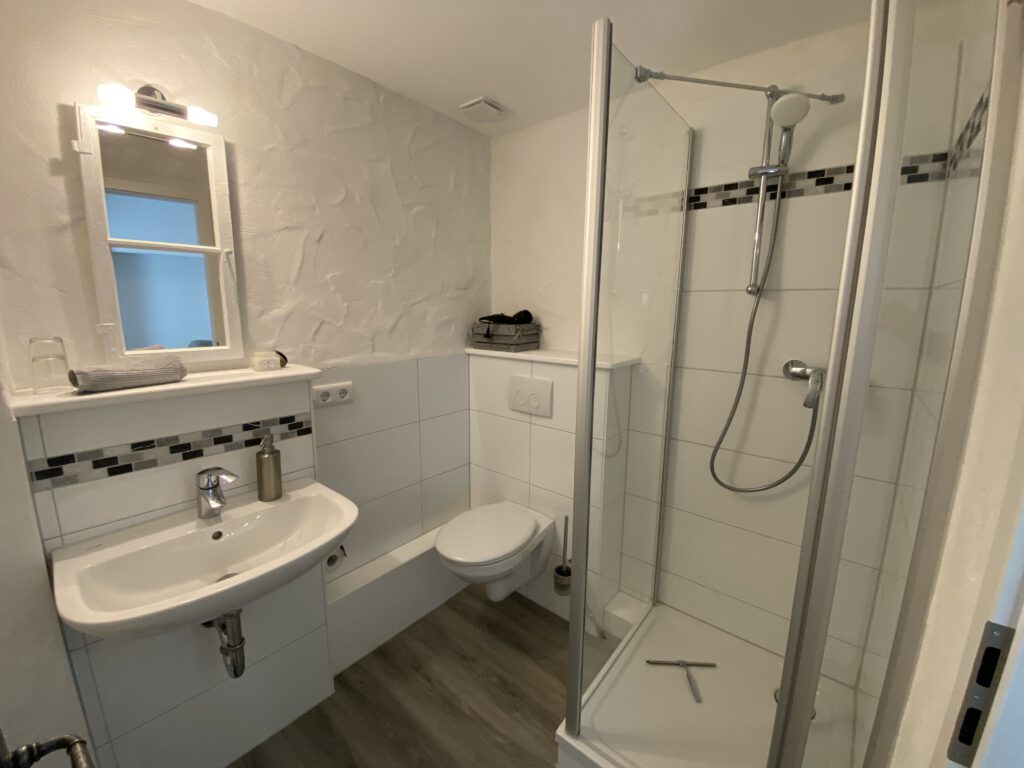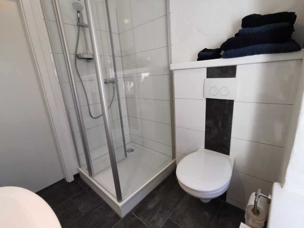 Alle Zimmer haben ein eigenes Badezimmer, mit Dusche, Waschbecken und Toilette. Folgende Ausstattung ist in jedem Gästezimmer vorhanden: