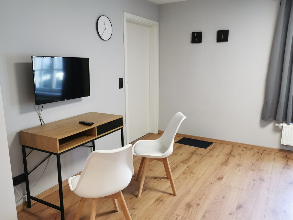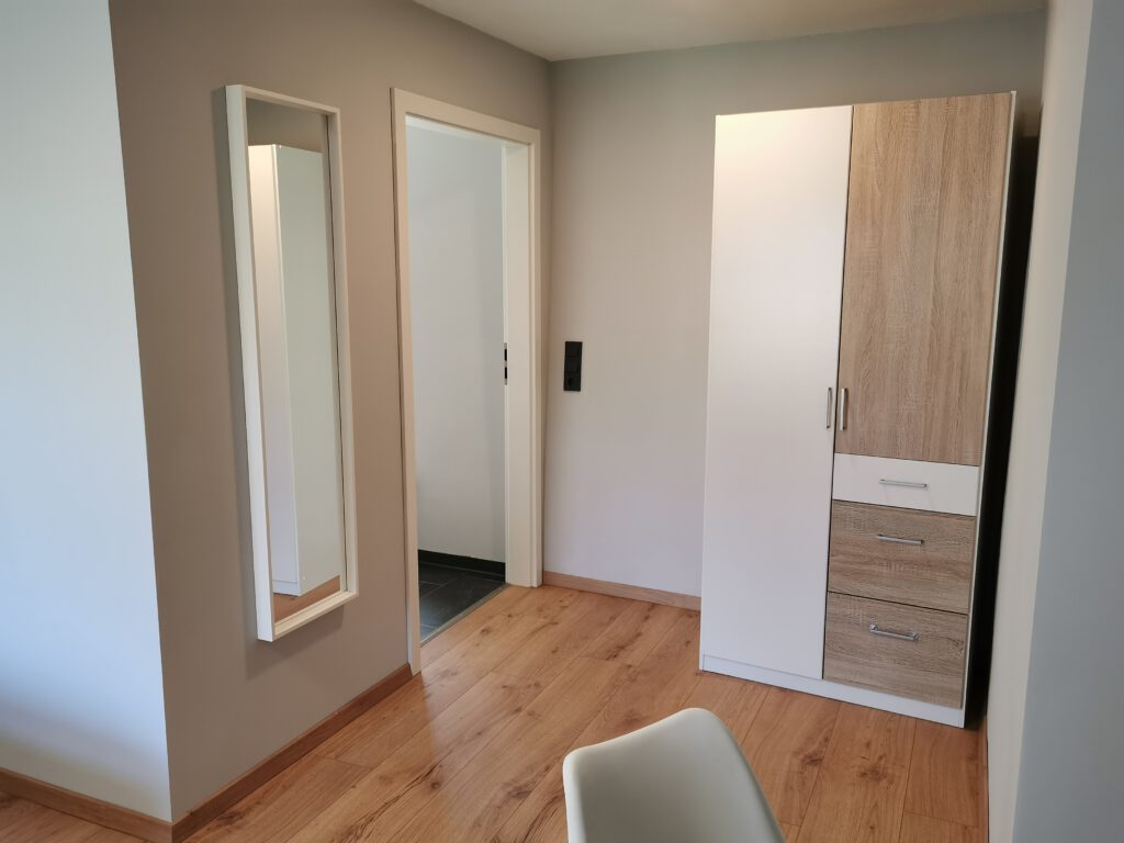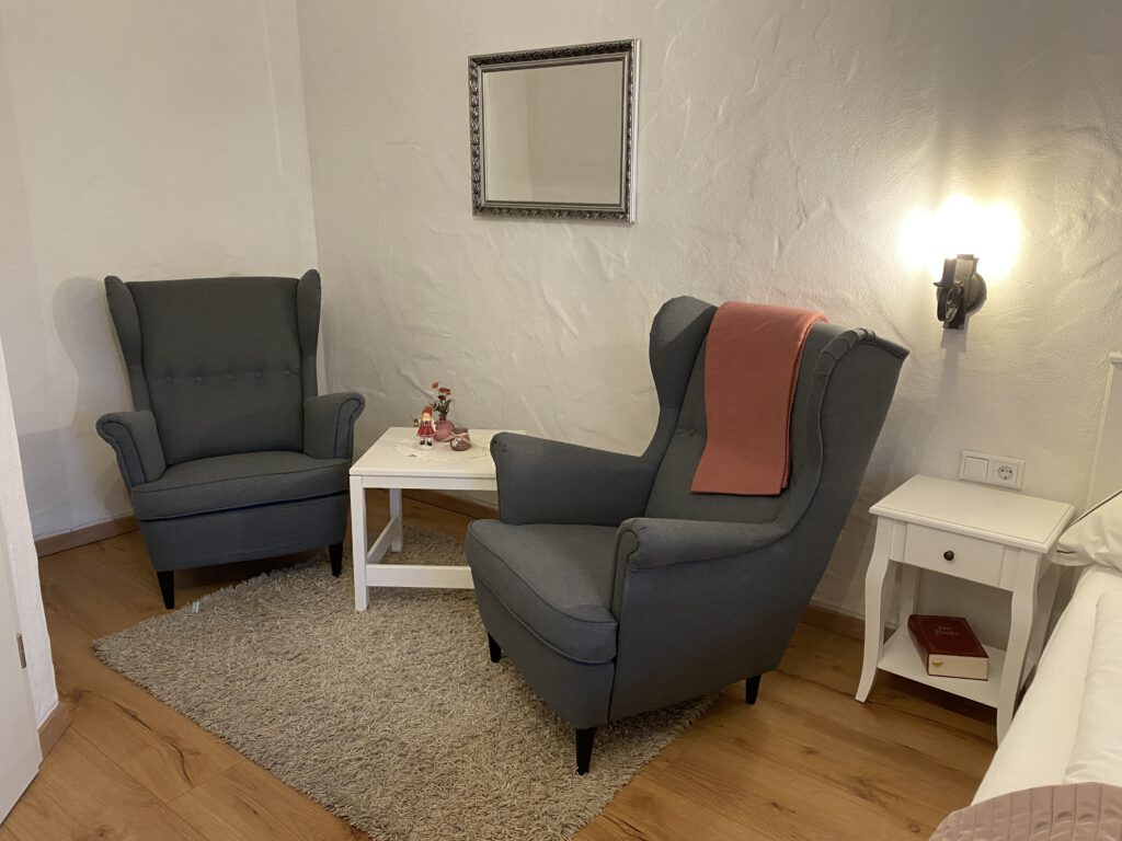 Das Zimmer liegt als einziges in der ganzen Anlagen im ersten Obergeschoss und ermöglicht dadurch einen weitläufigen Blick in den dahinterliegenden Wald. Das Zimmer verfügt über ein Doppelbett in den Maßen 1,60×2,00 m. Von den zwei kleinen Sesseln lässt sich wunderbar der Wald beobachten.