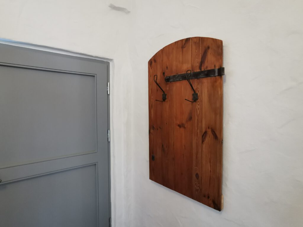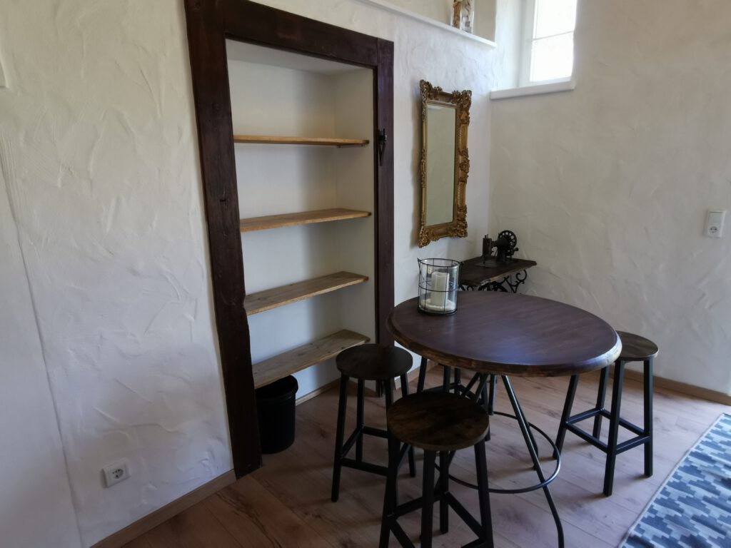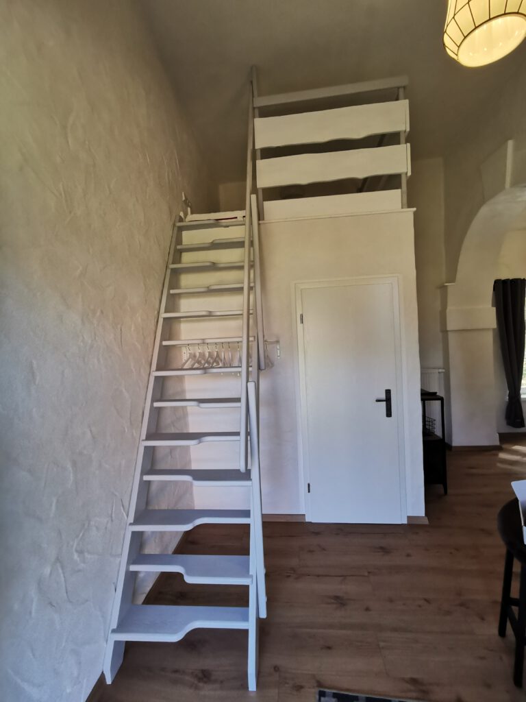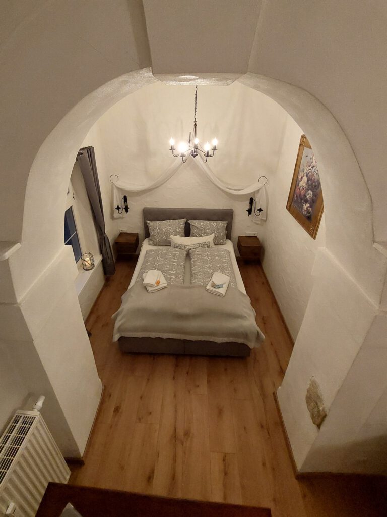 Unser kleines Familienzimmer liegt im „Westflügel“ unseres Anwesens. Der Zugang ist ebenerdig und separat gestaltet. Im vorderen Teil befindet sich der Wohnbereich und der Aufgang zum Kinderschlafplatz (die Belegung des „Kinderzwingers“ ist extra zu erfragen). Hinter dem großen original historischen Bogen, der das Zimmer teilt, erstreckt sich das Schlafgemach (Bettmaße: 1,60×2,00 m).
